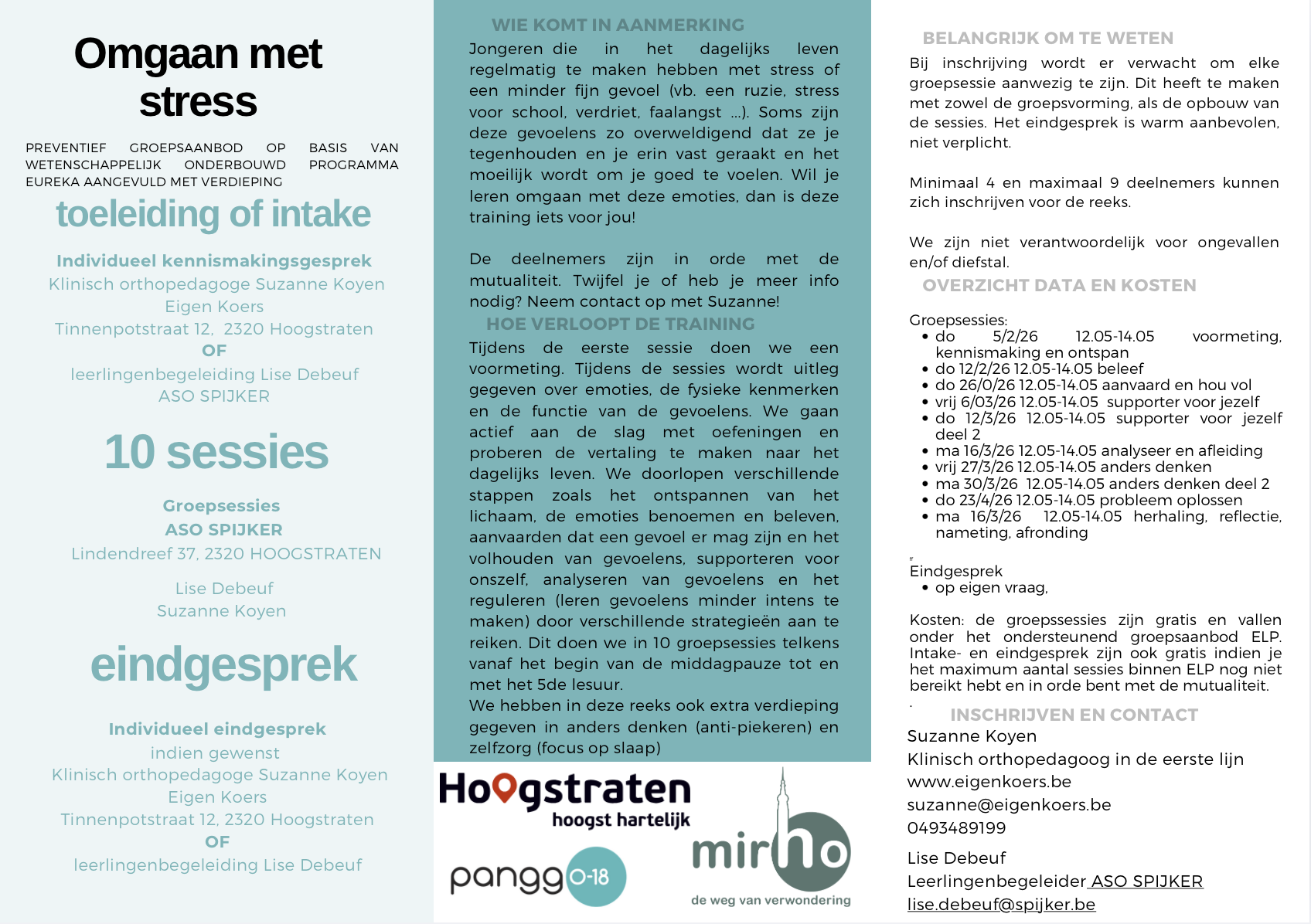 Reeks van 8 sessies van 1,5h, waarbij wordt afgewisseld tussen informatie geven, individuele oefeningen en oefeningen in kleine groep. De sessies gaan door in ASO SPIJKER, tijdens de middagpauze en het 5de lesuur op donderdagen.